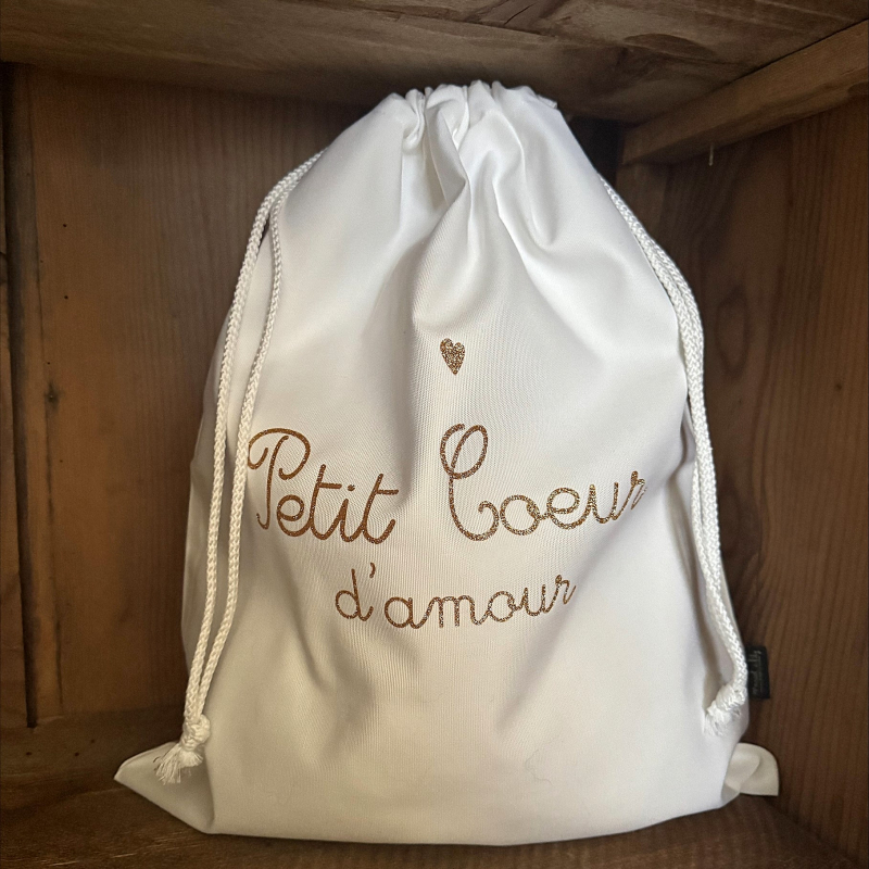 Adorable sac baluchon pour votre petit coeur d'amour. A accrocher dans sa chambre, pour y glisser ses petits joujoux, ses couches, pour ranger son pyjama, son petit linge ...