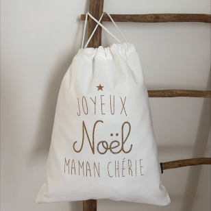 Pour un Noël durable sous le signe du zéro déchet craquez sur notre joli baluchon " Joyeux Noël maman chérie", tellement mignon. Vous pourrez y glisser plein de petits cadeaux à votre maman chérie et le déposer sous le sapin tel un objet de décoration.