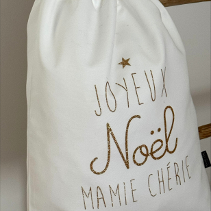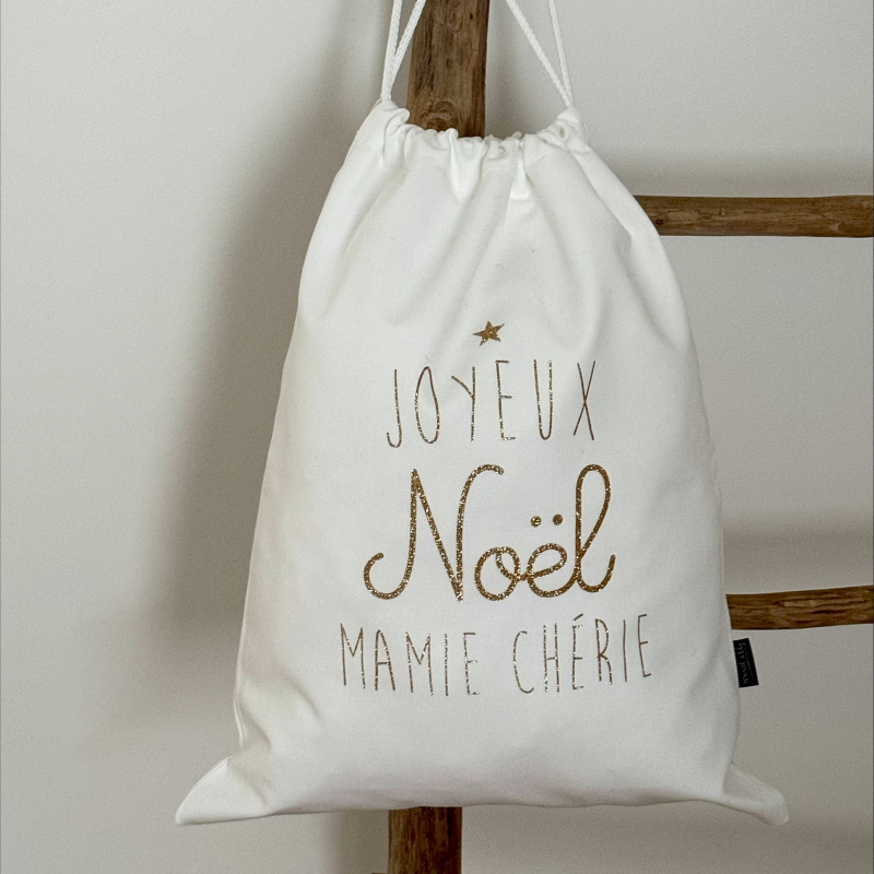 Pour un Noël durable sous le signe du zéro déchet craquez sur notre joli baluchon " Joyeux Noël maman chérie", tellement mignon. Vous pourrez y glisser plein de petits cadeaux à votre mamie chérie et le déposer sous le sapin tel un objet de décoration.