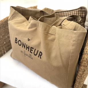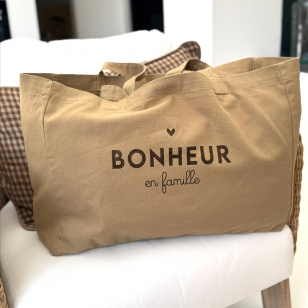 Grand sac cabas 100 % coton délavé pour un look hyper stylé et décontracté, coloris sable avec son imprimé pailleté noir " Bonheur en Famille"