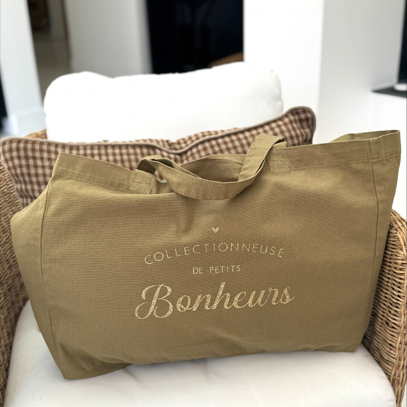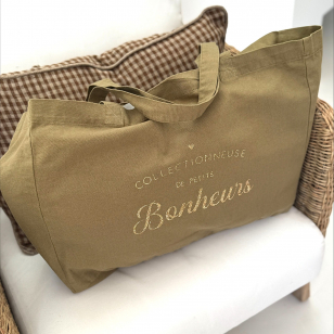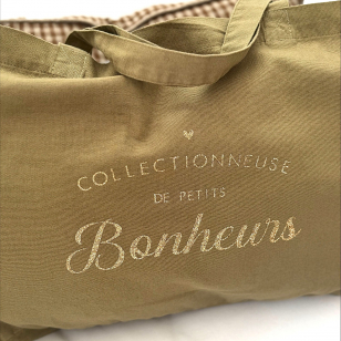 Shopping Bag 100 % coton délavé couleur vert olive avec son imprimé pailleté or "Collectionneuse de petits bonheurs"