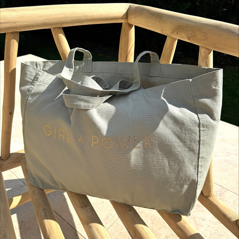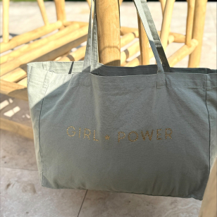 Shopping Bag 100 % coton délavé couleur sauge avec son imprimé pailleté or "Girl Power"
