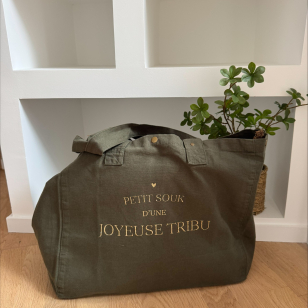 Grand sac cabas 100 % coton OEKO TEX légèrement délavé pour un look hyper stylé et décontracté, coloris vert forêt avec son imprimé pailleté or "Petit Souk d'une Joyeuse Tribu"