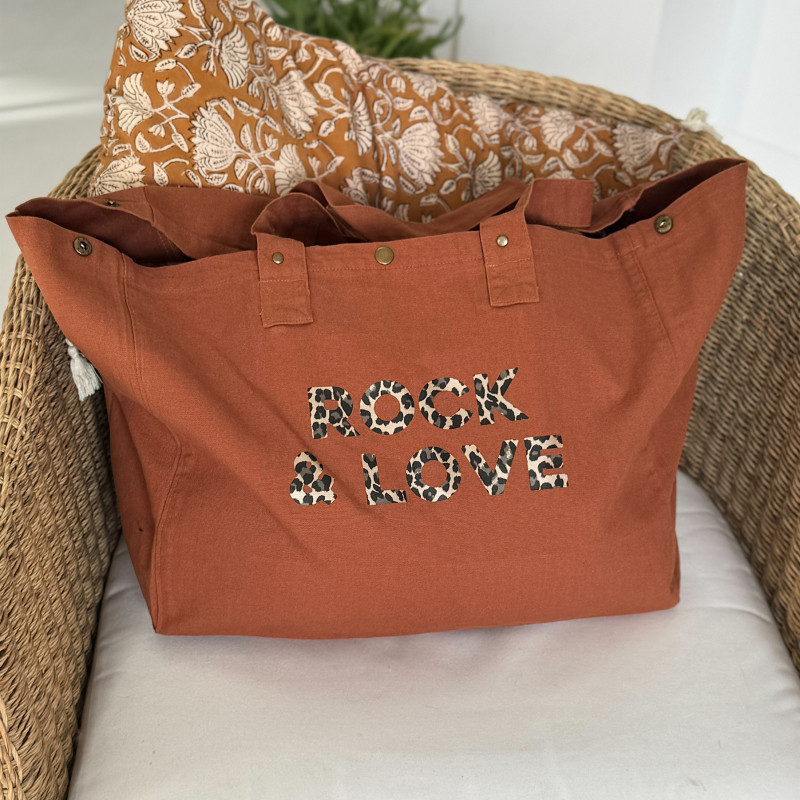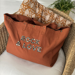 Grand sac cabas 100 % coton délavé pour un look hyper stylé et décontracté, coloris caramel avec son imprimé pailleté léopard "Rock and Love"