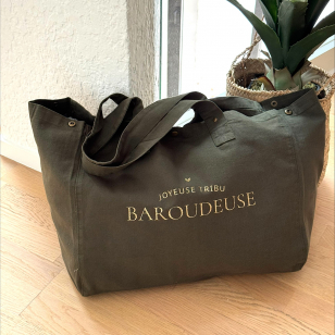 Grand sac cabas 100 % coton délavé pour un look hyper stylé et décontracté, coloris vert forêt avec son imprimé pailleté or "Joyeuse Tribu Baroudeuse"