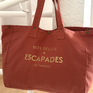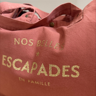 Grand sac cabas 100 % coton délavé pour un look hyper stylé et décontracté, coloris bois de rose avec son imprimé pailleté or "Nos Belles Escapades en Famille"