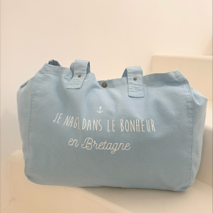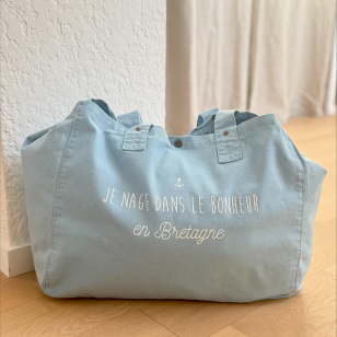 Grand sac cabas 100 % coton OEKO TEX légèrement délavé pour un look hyper stylé et décontracté , coloris bleu pastel et son imprimé blanc velours "Je nage dans le Bonheur en Bretagne"