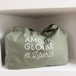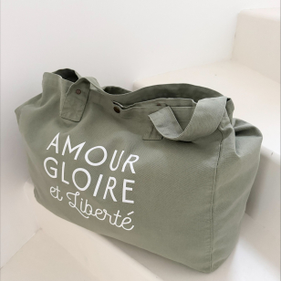 Grand sac cabas 100 % coton OEKO TEX légèrement délavé pour un look hyper stylé et décontracté , coloris vert amande et son imprimé blanc velours "Amour Gloire et Liberté"