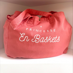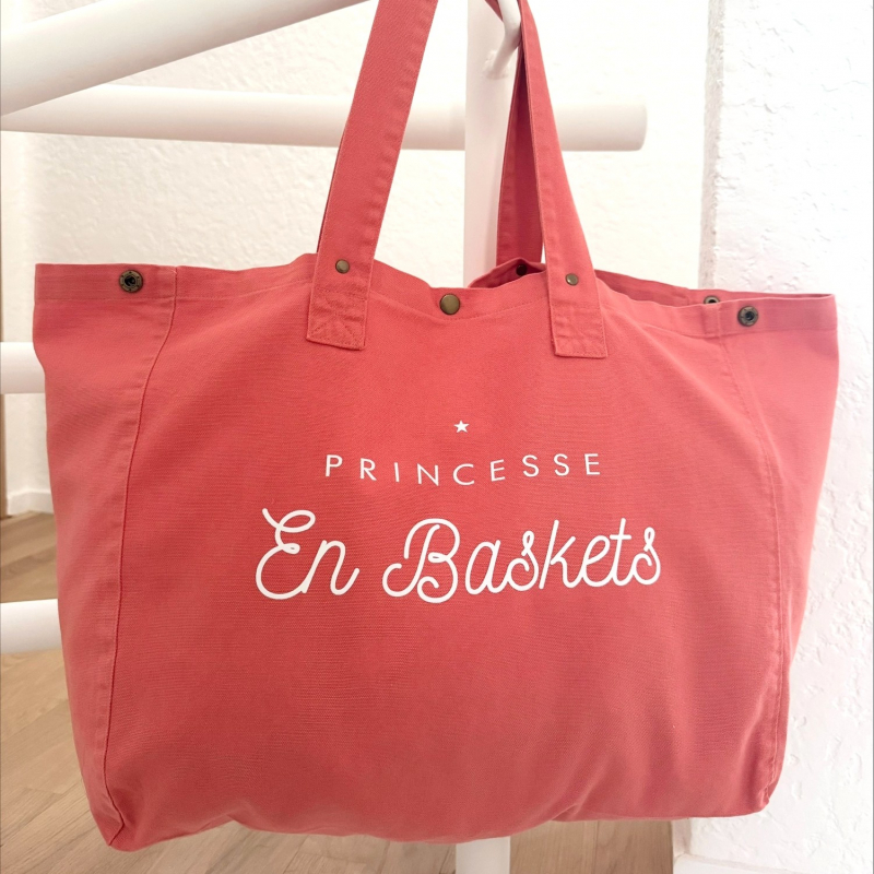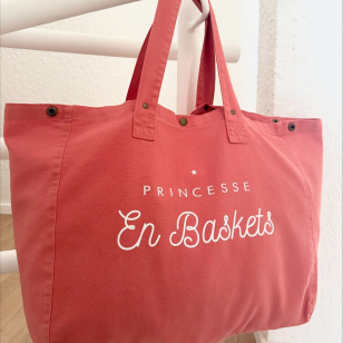 Grand sac cabas 100 % coton OEKO TEX légèrement délavé pour un look hyper stylé et décontracté , couleur rose corail et son imprimé blanc velours Princesse en Baskets"