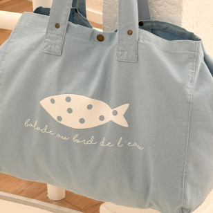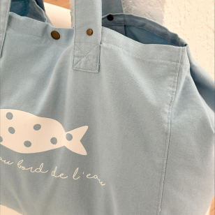 Grand sac cabas 100 % coton OEKO TEX légèrement délavé pour un look hyper stylé et décontracté , couleur bleu pastel et son imprimé blanc velours "Balade au bord de l'eau"