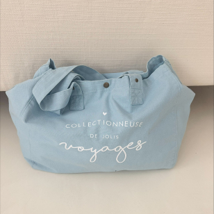 Grand sac cabas 100 % coton OEKO TEX légèrement délavé pour un look hyper stylé et décontracté , couleur bleu pastel et son imprimé blanc velours "Collectionneuse de jolis voyages"