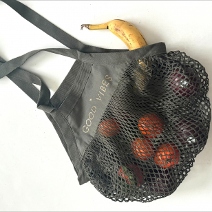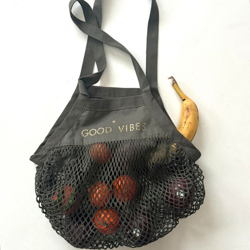 Sac filet à provisions en coton biologique couleur kaki avec son message pailleté or GOOD VIBES hyper léger et super costaud avec son tissage dense. Le top pour aller au marché, à la plage ou en vadrouille avec style.