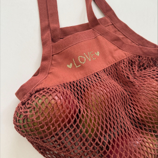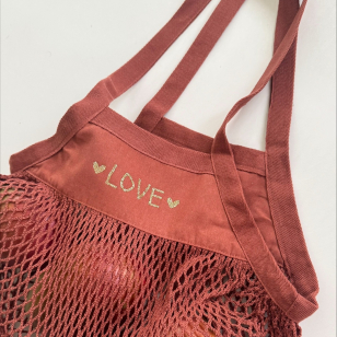 Sac filet à provisions en coton biologique couleur rouge oranger avec son message pailleté or LOVE hyper léger et super costaud avec son tissage dense. Le top pour aller au marché, à la plage ou en vadrouille avec style.