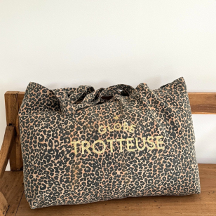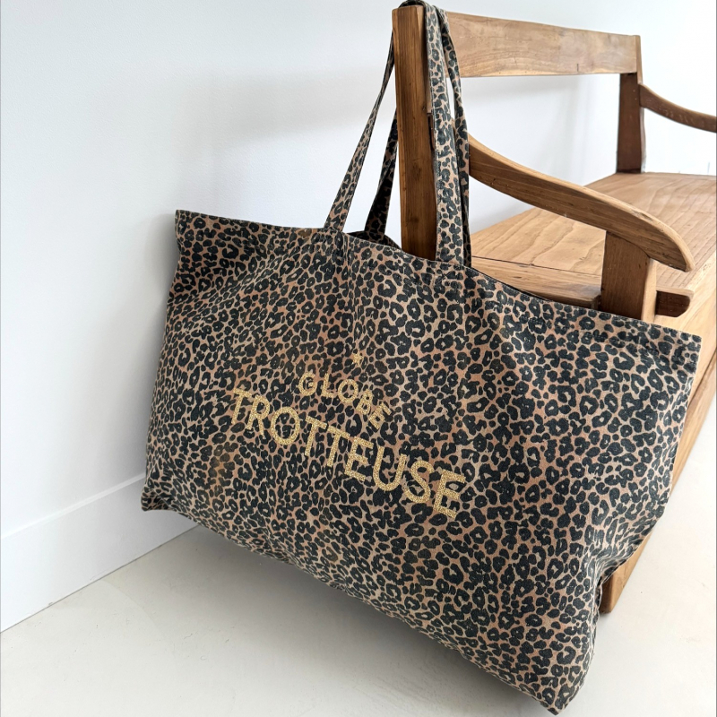 Craquez pour notre nouveau Maxi Cabas format XXL 100% coton imprimé léopard avec son message pailleté or GLOBE TROTTEUSE.