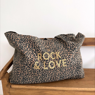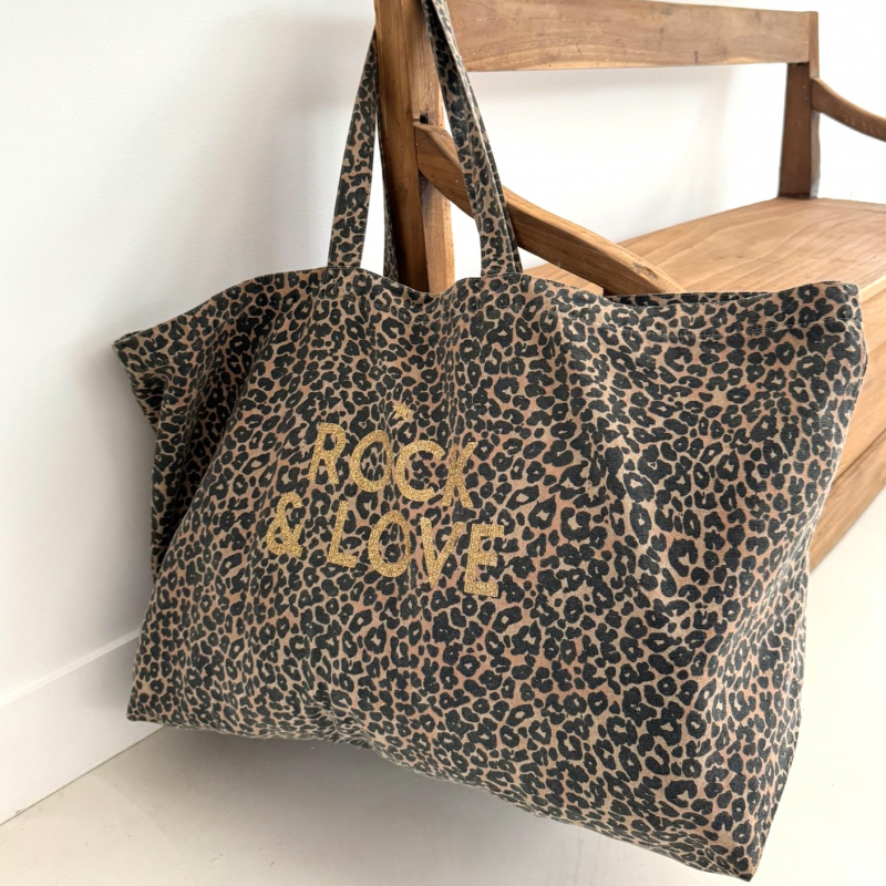Craquez pour notre nouveau Maxi Cabas format XXL 100% coton imprimé léopard avec son message pailleté or Rock and Love.