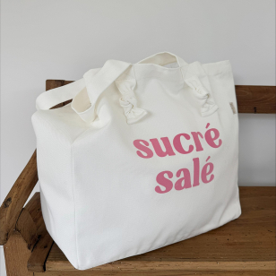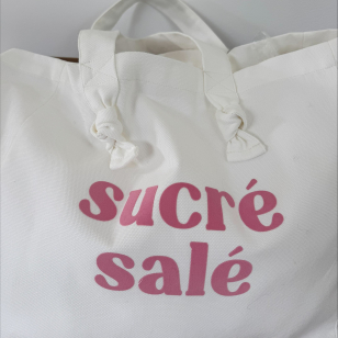 Cabas couleur blanc milk avec ses petits noeuds et son message "Sucré Salé" en velours rose, confectionné dans une jolie toile de coton 320 gr certifiée Oeko Tex.