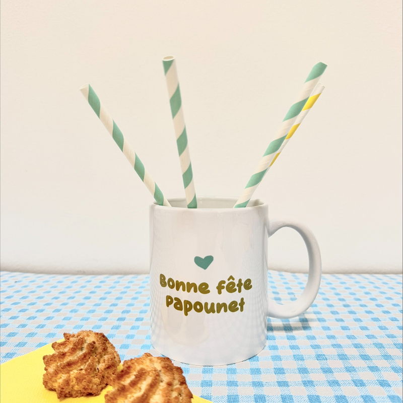 Nouveau mug Bonne Fête Papounet de la collection "Pop" colorée et pétillante pour voir la vie en couleur. Tellement craquant pour p'tit déjeuner en amoureux dans la joie et la bonne humeur. couleur : vert et bleu