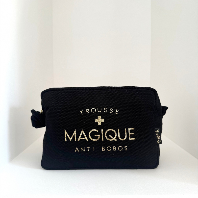Grande trousse premiers secours couleur noire pour toute la famille, avec son message pailleté or " Trousse Magique anti Bobos "