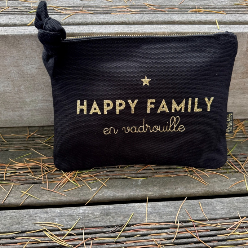 Craquez sur notre jolie pochette couleur noire avec son imprimé or pailleté " Happy Family en Vadrouille ".