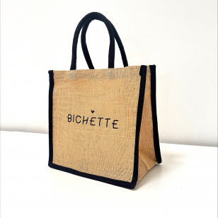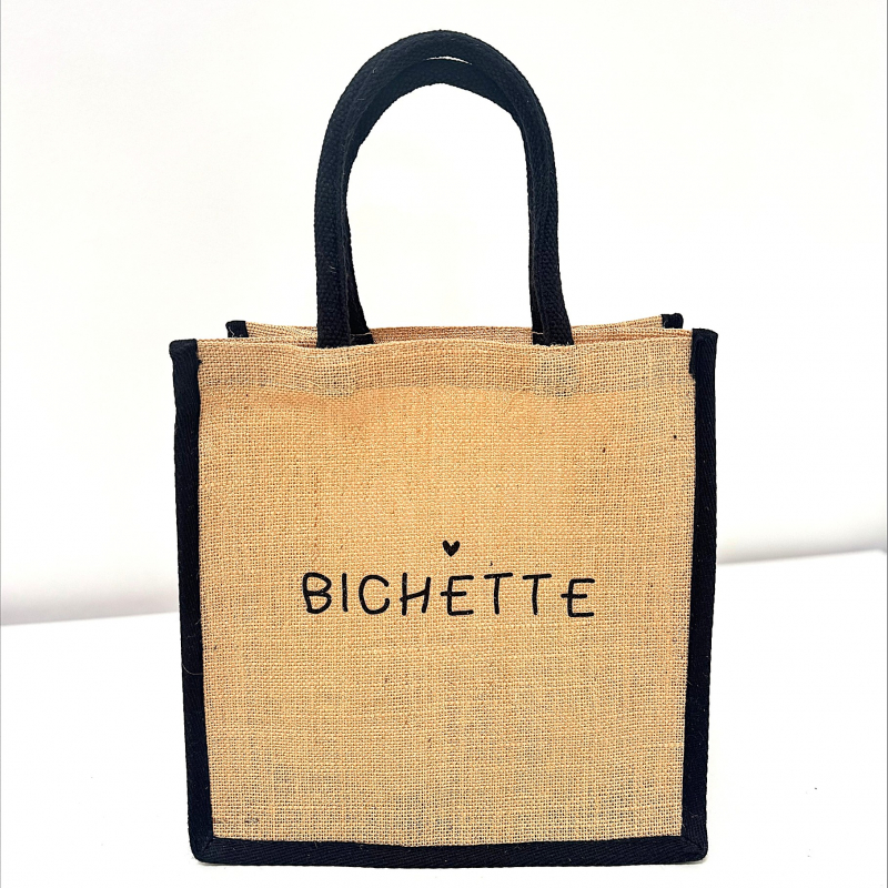 Petite taille, grandes aventures ! Mini sac en jute naturelle avec son message pailleté noir " Bichette".
