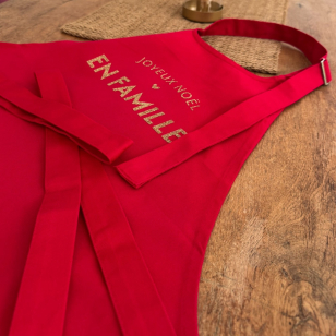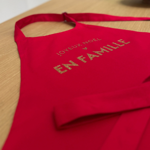 Préparez en famille plein de bons petits plats en cette veille de Noël avec notre joli tablier rouge et son imprimé pailleté or.